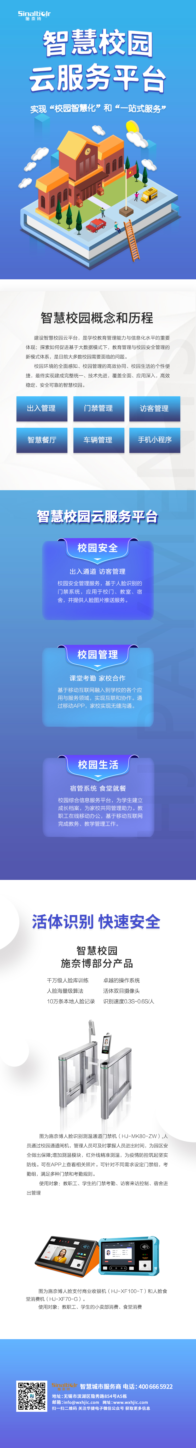 无锡华捷智慧校园一脸通解决方案,是以A人脸识别技术、移动互联网大数据等新一代信息技术为基础,以智慧校园管理云平台、人脸识别智能终端智慧校园APP为依托,为校园打造集校智能安防、智慧生活、智慧教务为一体的智慧校园管理平台,校园内涉及师生人员进出门禁、访客、教职工老勤、合堂消费、学生智能宿管、班车管理、车辆出入管理等方面的事项均统一汇聚于此平台,有效助力校园、平安校园的建设。