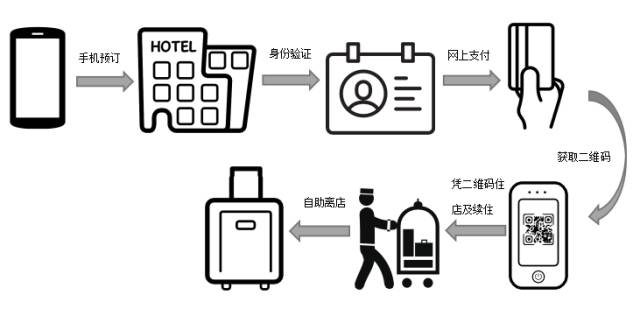 未来,你不需要在酒店前台办理入住,只需 通过手机端选择喜欢的房间,认证客户身份,网络支付,接着系统生成一条虚拟二维码门匙,到店后只需点击打开二维码图片放在二维码门锁读码区,自己的手机就能打开房门。在你离店时,不用归还房卡,快速自如办理退房。