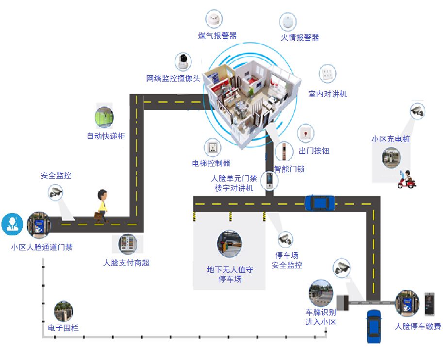 智慧社区包含基础设施、物业管理、购物、出行、物流等多方面,是“智慧城市”实施的重要环节。通过采用先进的人脸识别、物联网、云计算、大数据等技术,实现社区个人智能化、家庭智能化、社区管理智慧化、商圈电子商务化、公共服务便利高效化,为小区居民营造一个安全、舒适、便利的智慧化生活环境。
