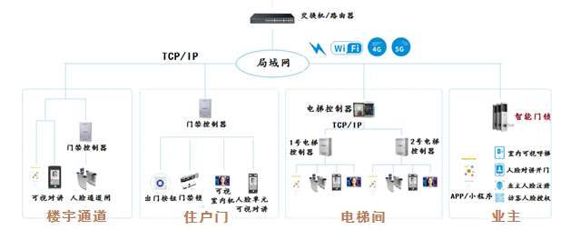 人脸识别楼宇一脸通管理系统由楼宇物业管理云服务平台、楼宇对讲应用APP/小程序、人脸通道门禁闸机(楼宇出入)、人脸单元门可视对讲机(单元出入)、可视室内机(可选)、门禁控制器、门禁锁、出门按钮,物业管理中心计算机、楼宇网络、互联网等组成,实现楼宇和单元出入口控制的人性化和智能化