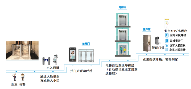 通过业主APP拍照上传人脸信息,登记业主信息,注册成功后即可通过人脸识别出入指定通道和电梯,系统自动保存业主出入信息。