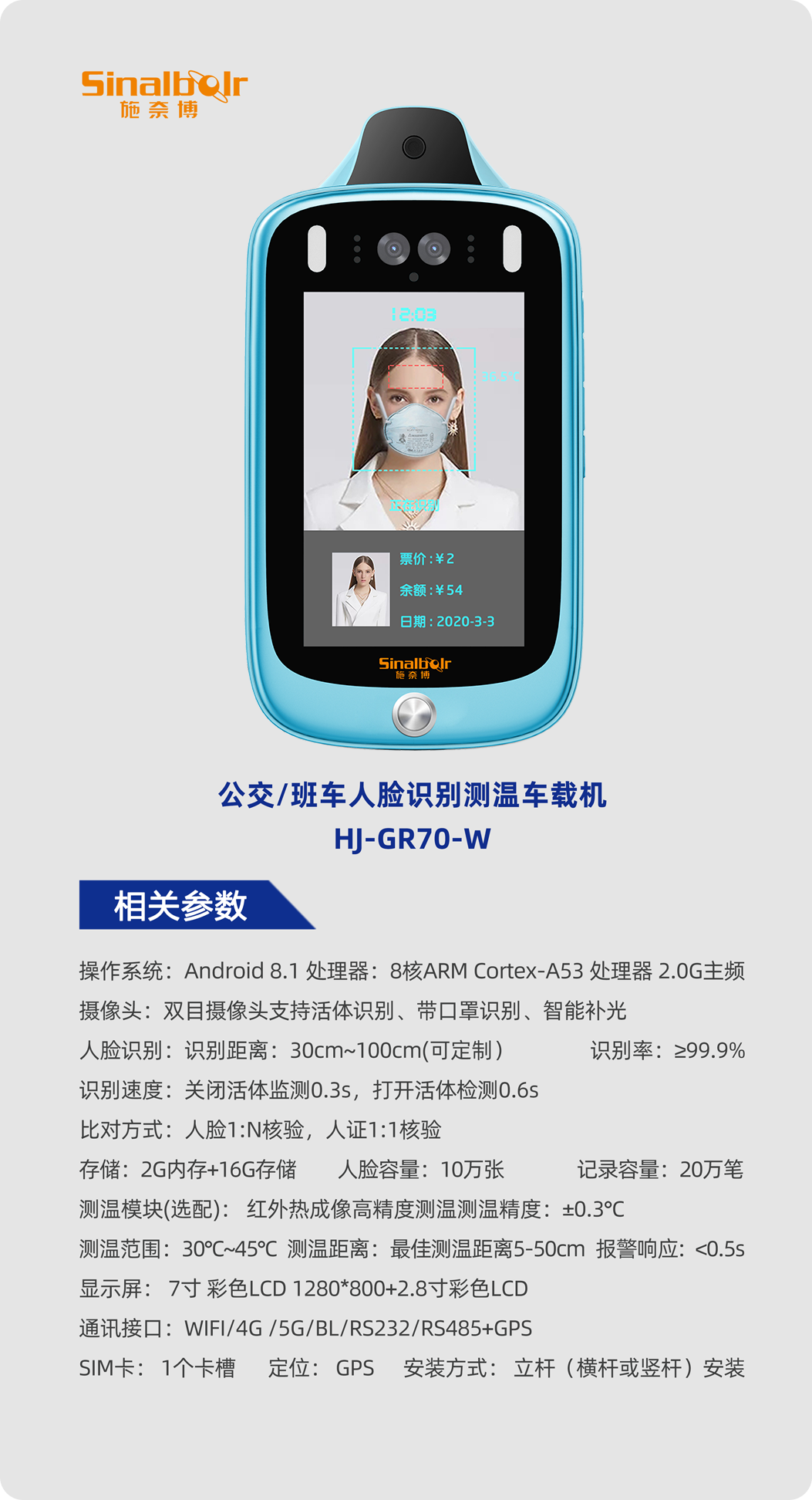 那么,既然是刷脸乘车,能不能使用一张照片来“蒙混过关”呢?施奈博公交、班车人脸识别测温车载机在设计上,就考虑到了这个问题,通过采取摄像头组的方式,当乘客刷脸乘车时,人脸识别测温车载机内置的双目摄像头可迅速采集完整立体的人脸数据,能有效保障安全性。
