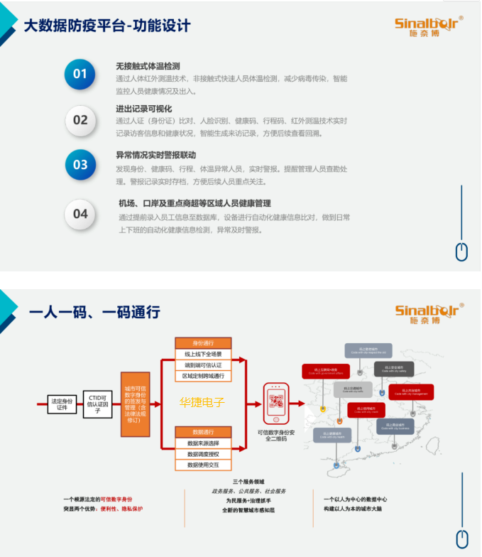 华捷电子利用自身在大数据融合加工、分析研判、共享开放等方面的能力,支撑起包括人员信息追踪、交通道口核查、查询解除医学观察信息、企业复工、全国疫情信息共享、“我的防疫站”专栏信息、社会数据接入融合等七大应用场景,为疫情联防联控、精准施策提供助力。