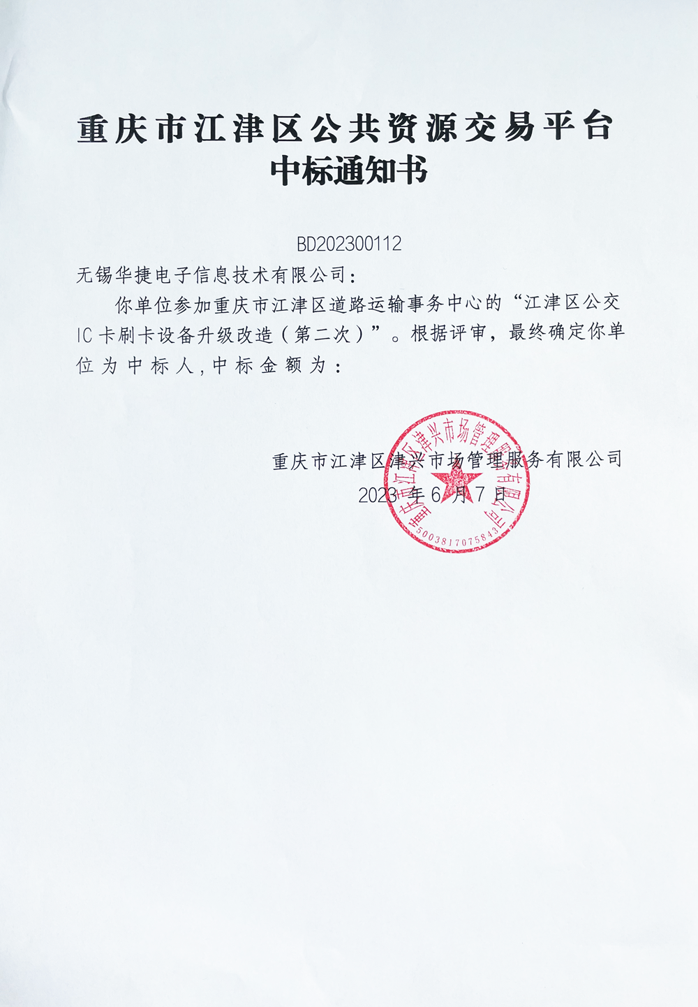 近日,我司又传来了喜讯,成功中标了“重庆市江津区公交IC卡刷卡设备升级改造”项目。成为众多竞争对手中的佼佼者。这一次成功中标离不开我司可靠的产品质量,过硬的技术能力以及良好的企业信誉。