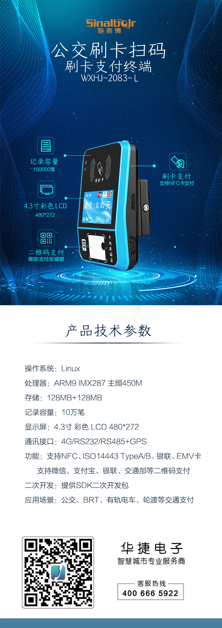本产品为我公司自主研发的新一代公交智能支付终端,型号为WXHJ-2083,分linux和安卓二个版本,有数码管和液晶两种显示方式可选。该产品外观小巧,模具精细,线条流畅优美,备有多种不同颜色可供选择,展现各种优势,堪称设计典范。