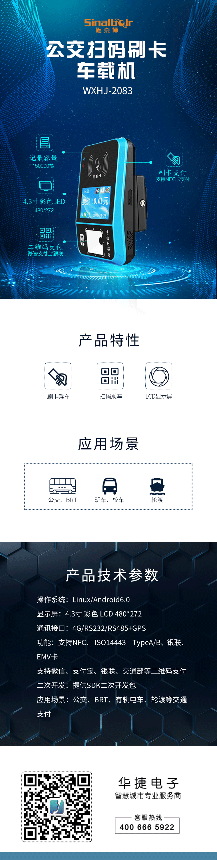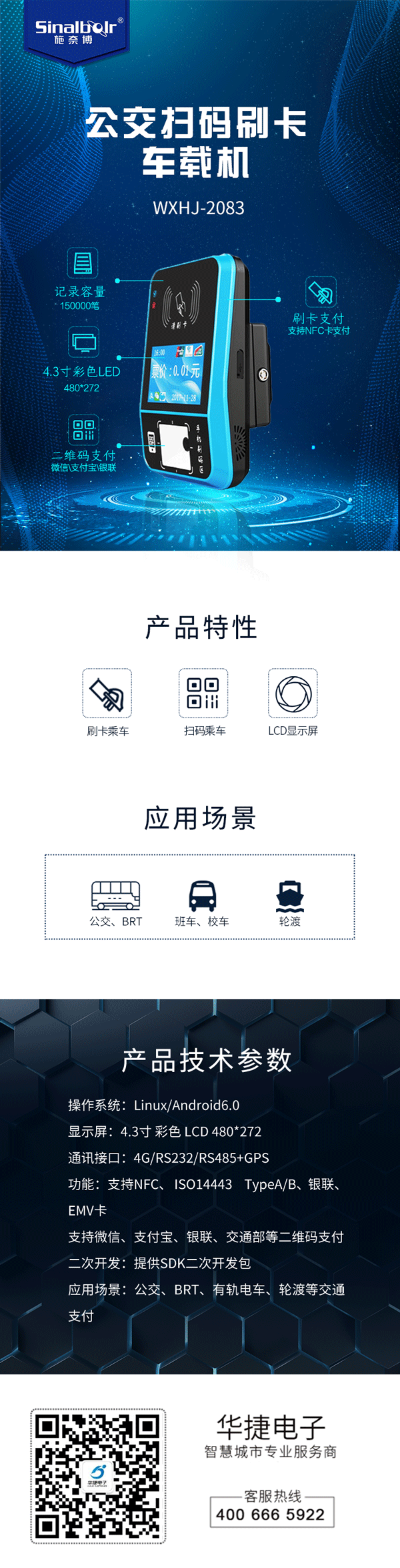 施奈博公交扫码车载机是华捷电子自主研发的新一代安卓版智慧公交类产品,集成刷卡与二维码支付功能,支持微信、支付宝、银联等方式支付票款,创新实用。