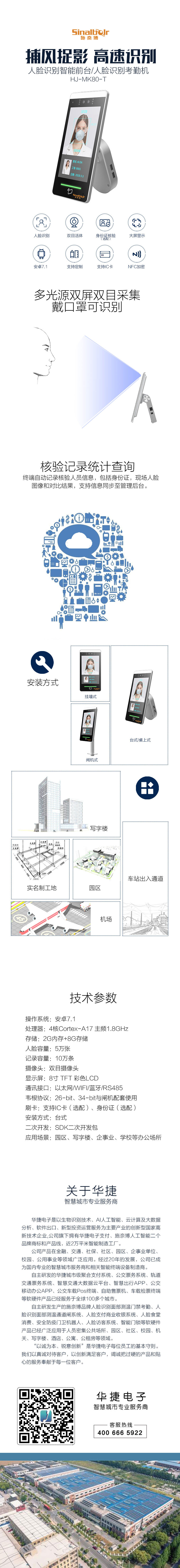 本产品为我公司自主研发的新一代基于人脸识别技术的智能前台考勤机,型号:HJ-MK80-T。该产品外观时尚,模具精细,线条流畅优美,展现各种优势,堪称设计典范。